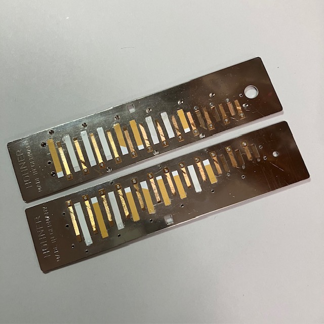 Replacement reed plate set for discontinued CBH 2012 Chromatic Harmonica. These are NOS and were supplied without windsaver valves. As you can see, they are now valved.